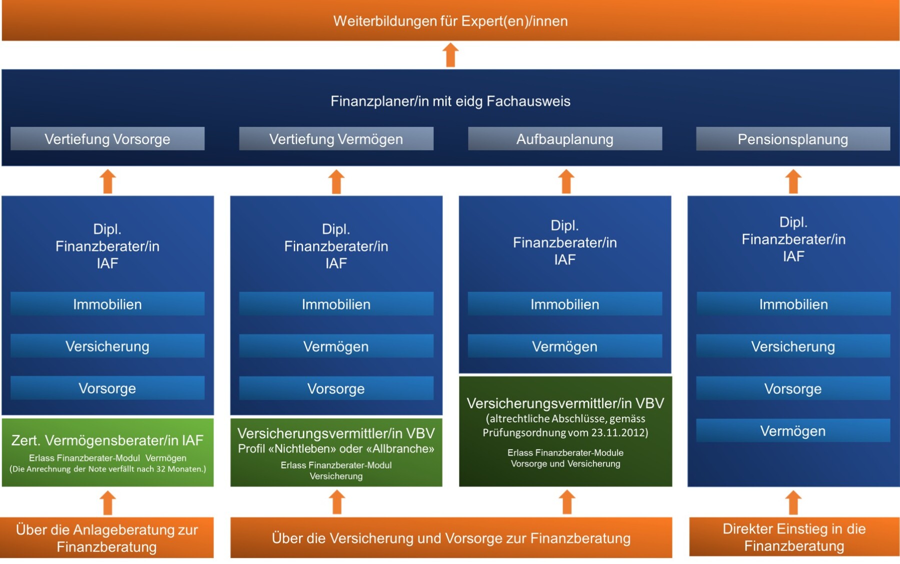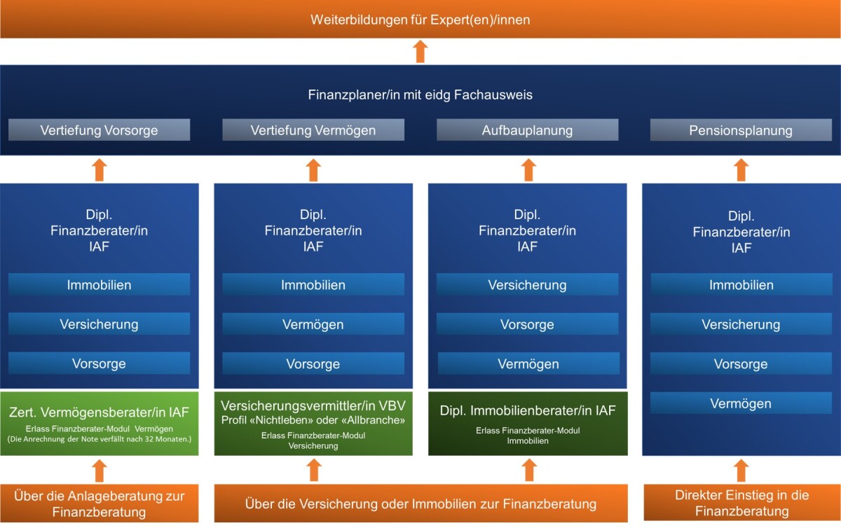 Die Studiengänge decken alle Themen für die Beratung von mittelständischen Privatkunden in der Schweiz ab. Sie sind so miteinander verknüpft, dass Sie Ihren persönlichen Bildungsweg möglichst flexibel gestalten können: Je nach Einstieg werden Ihnen im nächsten Schritt bestimmte Module erlassen. Der Fachausweis als Finanzplaner/in öffnet Ihnen die Türe zu verschiedenen anerkannten Weiterbildungen auf Expertenstufe.